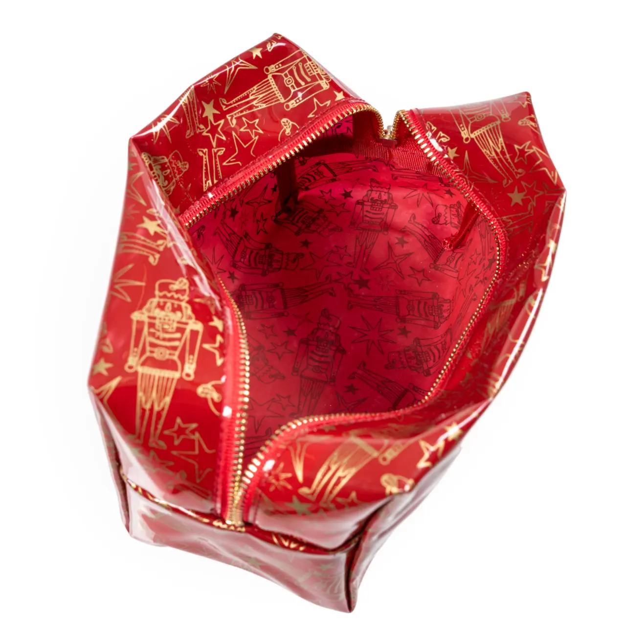 Kozmetická taška v úžasnej červenej farbe s motívom Luskáčika, pripomínajúcim vianočné sviatky, je skvelým doplnkom pre každého účinkujúceho.