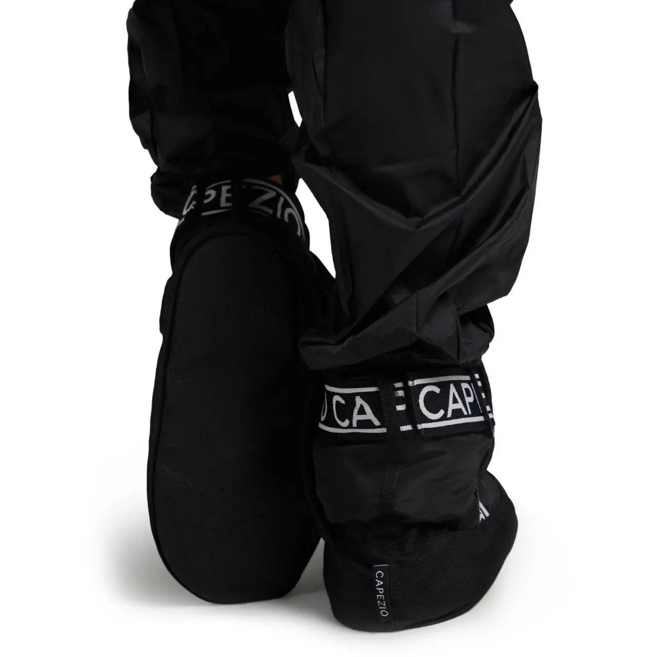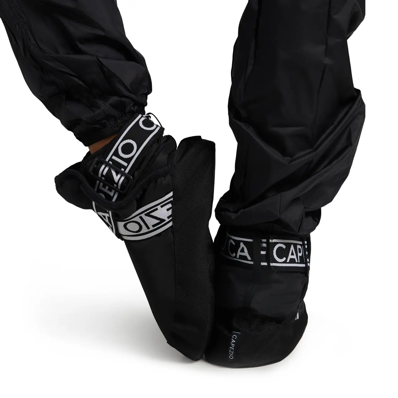 Protišmyková, mäkko polstrovaná podrážka zabezpečuje stabilný kontakt so zemou a rovnomerné rozloženie váhy, vďaka čomu sú ideálne na pohyb v tanečnej sále. Vonkajší materiál z taffeta polyesteru v kombinácii s mäkkou polyesterovou výplňou poskytuje príjemnú tepelnú izoláciu bez obmedzenia pohybu. Elastické, nastaviteľné pásiky s logom Capezio okolo členka zaručujú bezpečné, pohodlné a individuálne prispôsobenie.