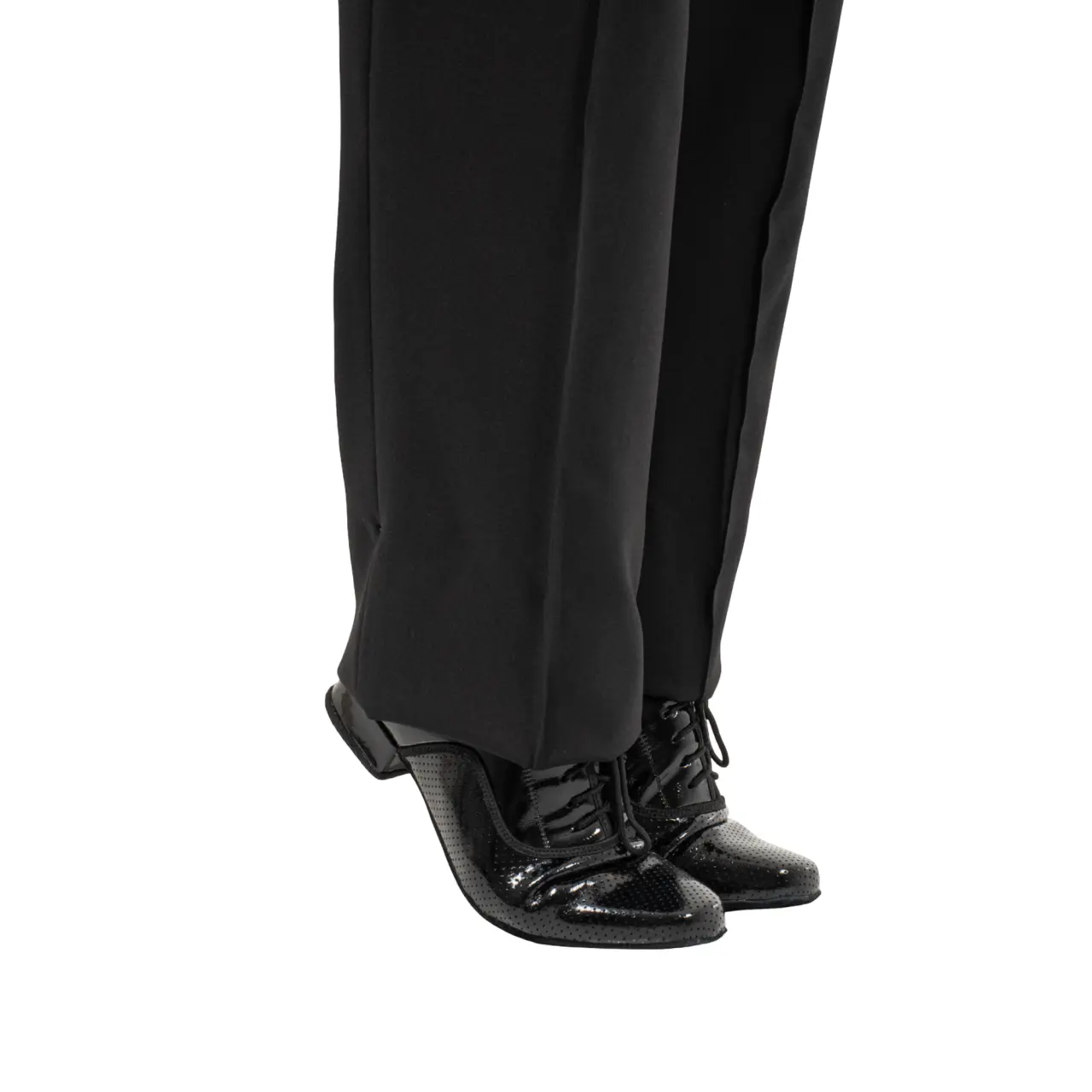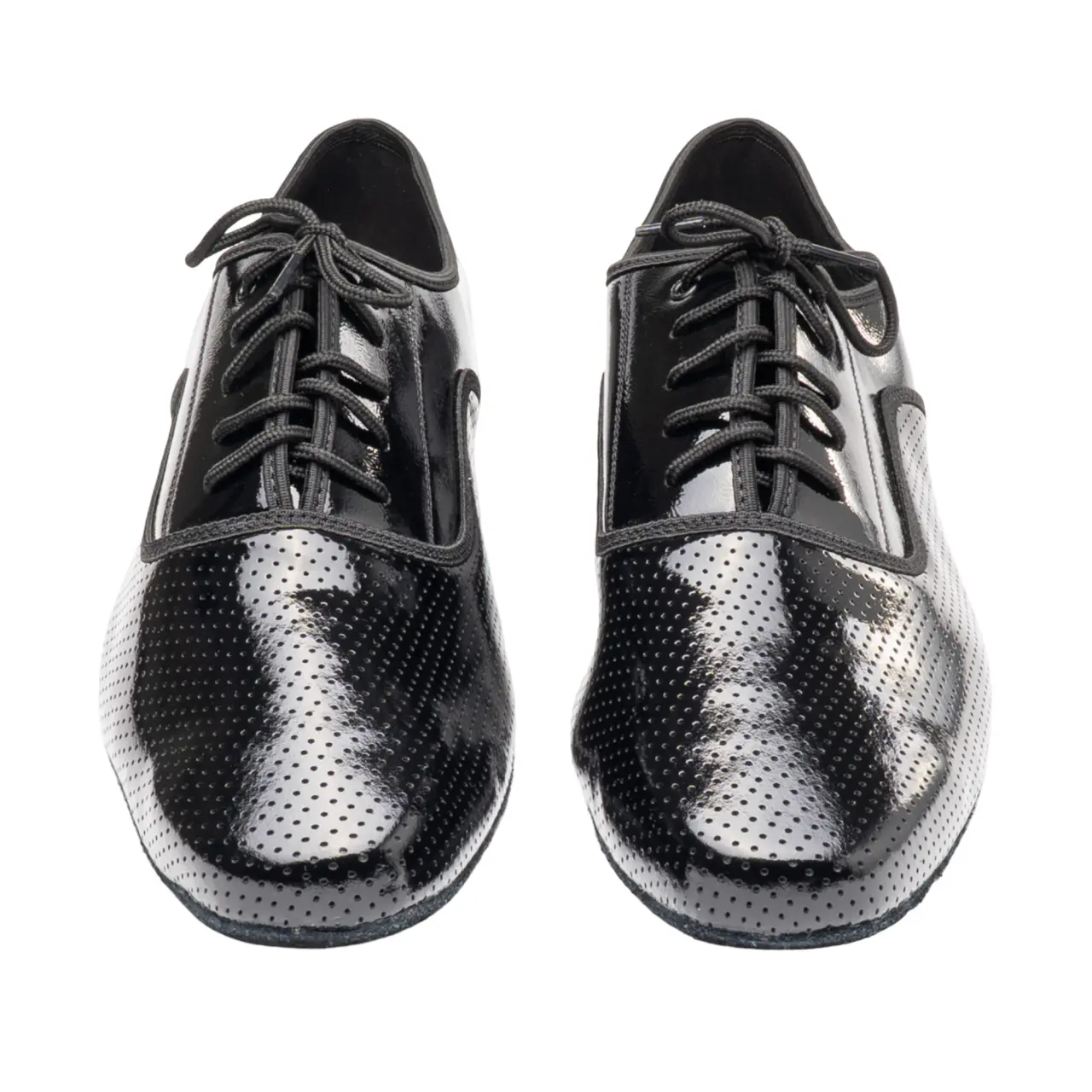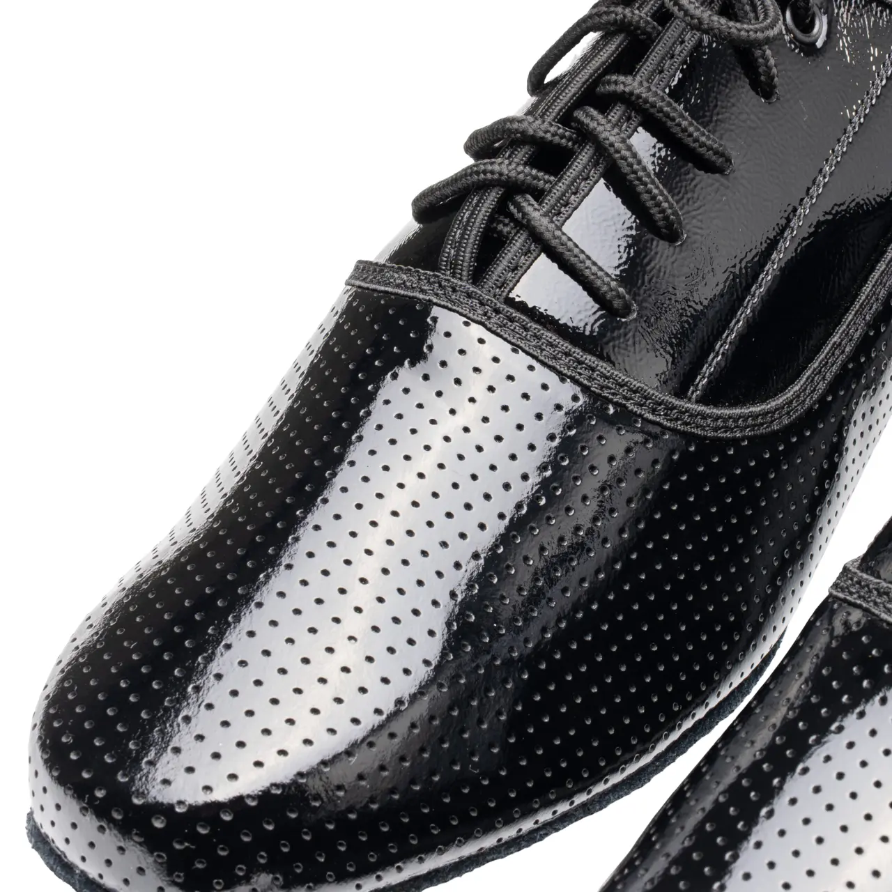 Zvršok je vyrobený z lakovaného patentu, ktorý dodáva topánkam luxusný lesk. Predná časť je jemne perforovaná, čo vytvára zaujímavý detail a zvýrazňuje elegantný charakter obuvi, zatiaľ čo ostatné časti sú riešené v hladkom patente pre čistý a nadčasový vzhľad.