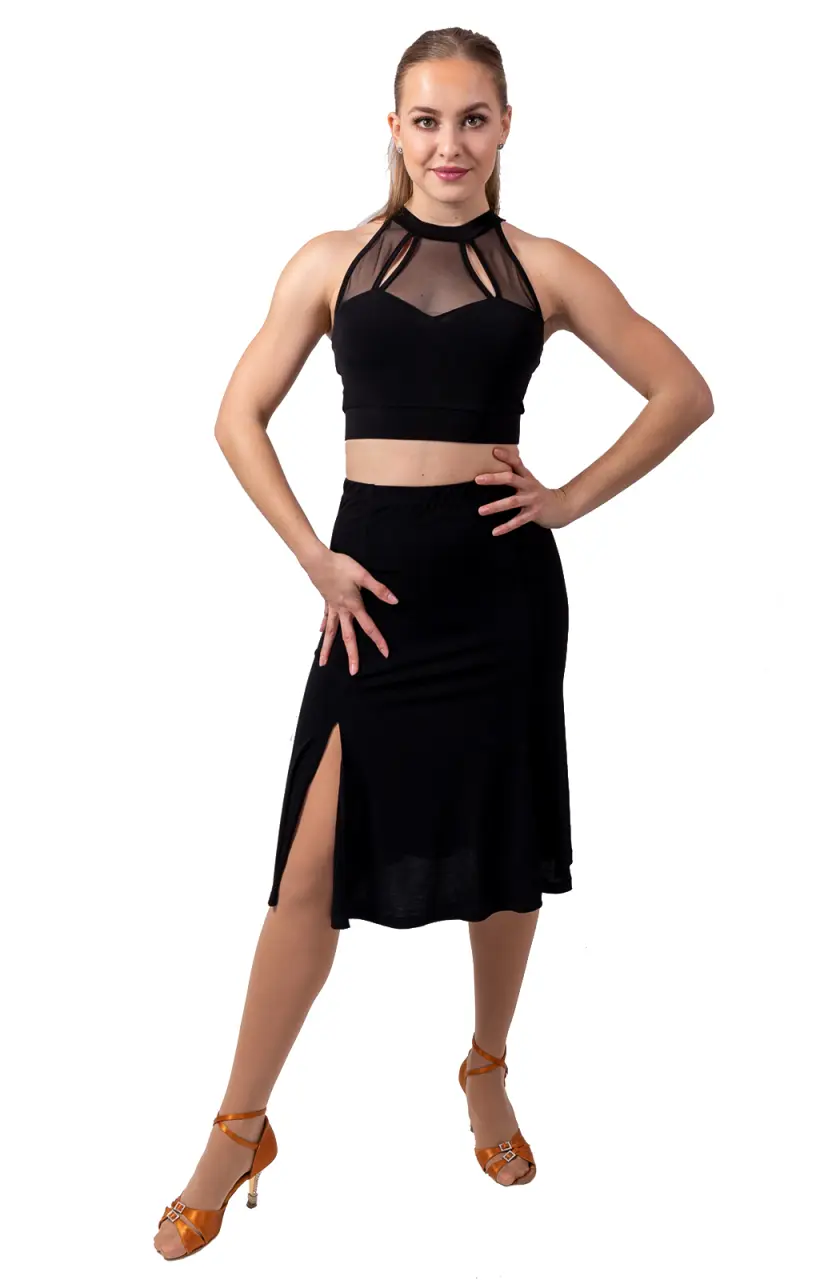 Zapínanie okolo krku zvýrazní ramená. V prednej časti je korzetový strih, ktorý pokračuje ku kruku sieťovinou. Po stranách sú v sieťovine olemované slzičky. Na chráte je pod lopatkami strih rovný, Slzička je v prostriedku, zvislá. Materiál je elastický a vzdušný zároveň. 90% polyamid a 10% spandex.