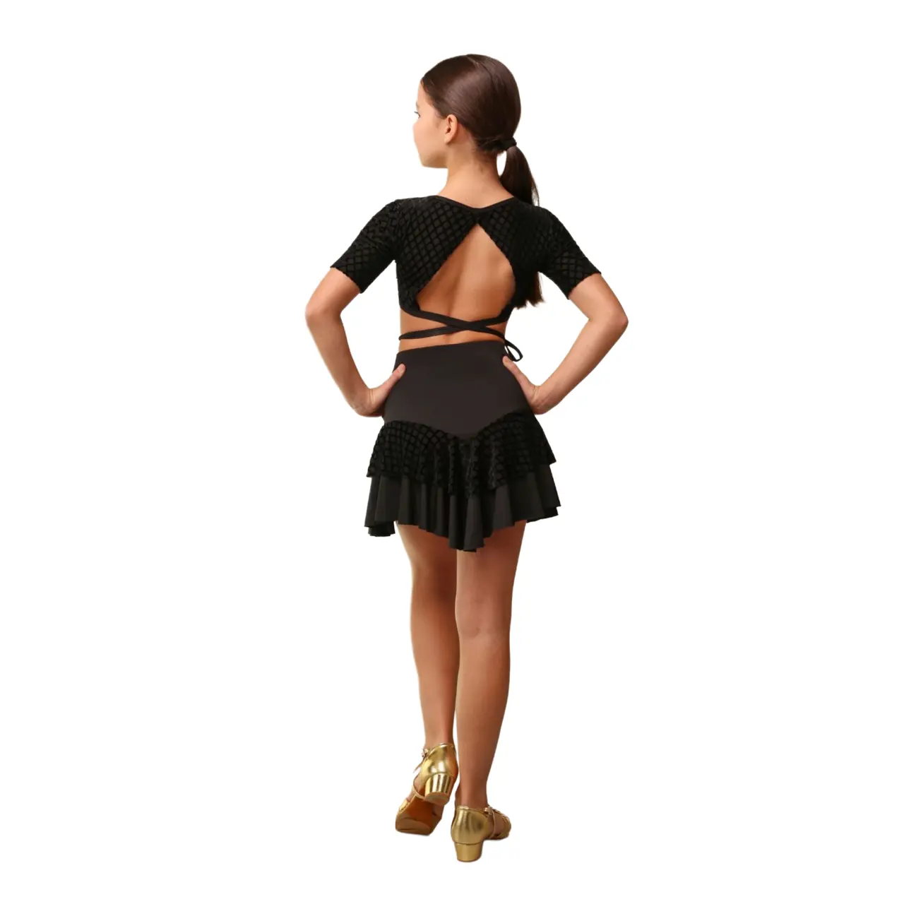 Dievčenský tanečný top Iona z kolekcie MINI NOIR vyniká elegantným dizajnom určeným pre latinskoamerické tance. Výrazný otvorený chrbát v kombinácii s nastaviteľným viazaním umožňuje prispôsobenie podľa potreby a zároveň spoľahlivo drží počas pohybu.